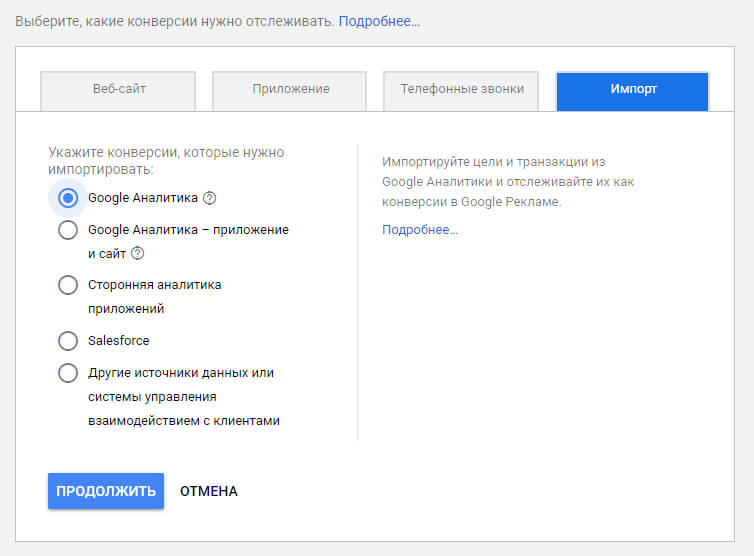 Выбираем раздел "Импорт" и отмечаем пункт "Импорт из Google Аналитики". На следующей странице отмечаем импорт транзакции покупка, и указываем, что ценность конверсии должна получаться из аналитики, где мы заранее настроили передачу ценности по стоимости заказанных товаров.