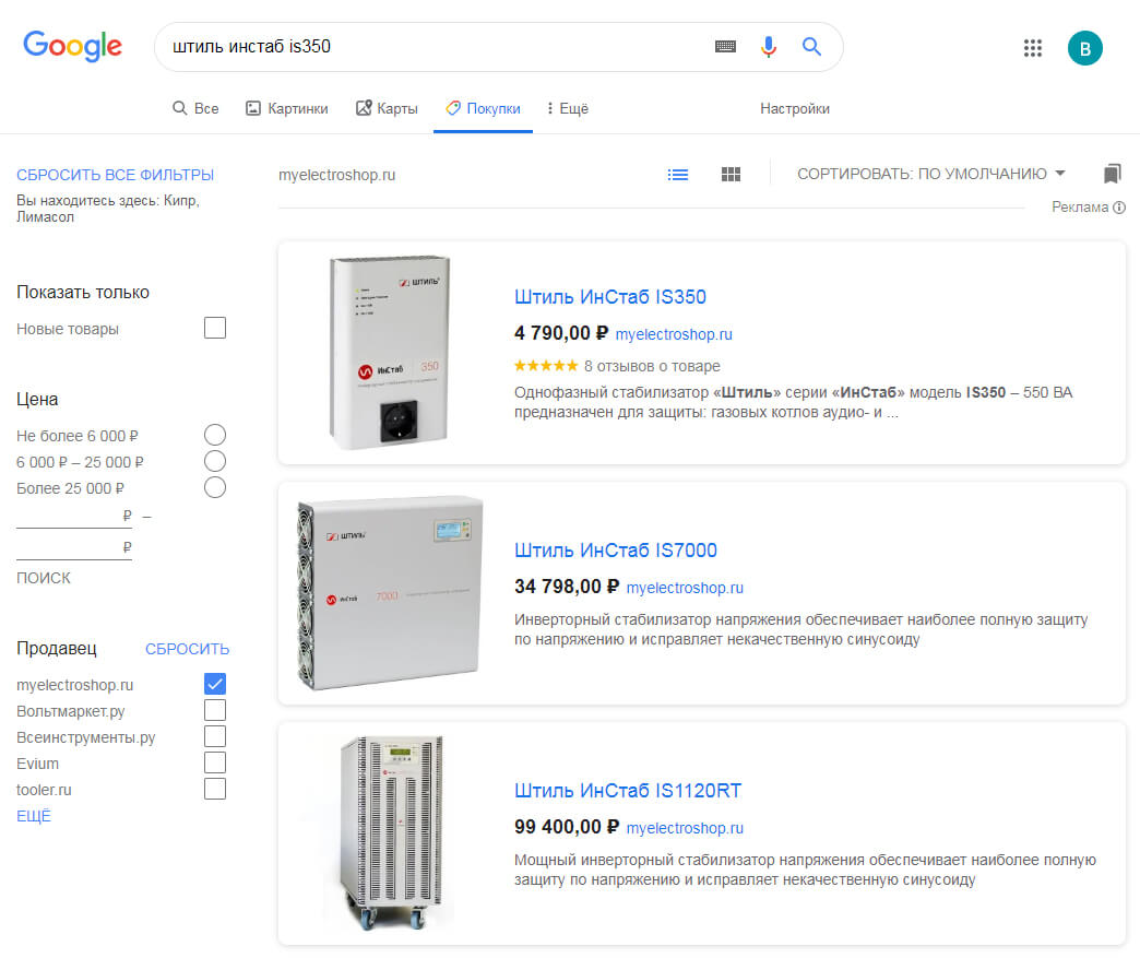 Там же, в карточке товара, нажав кнопку "Магазины", покупатель получает сравнение цен всех магазинов, разместивших свои предложения в Google Покупках: