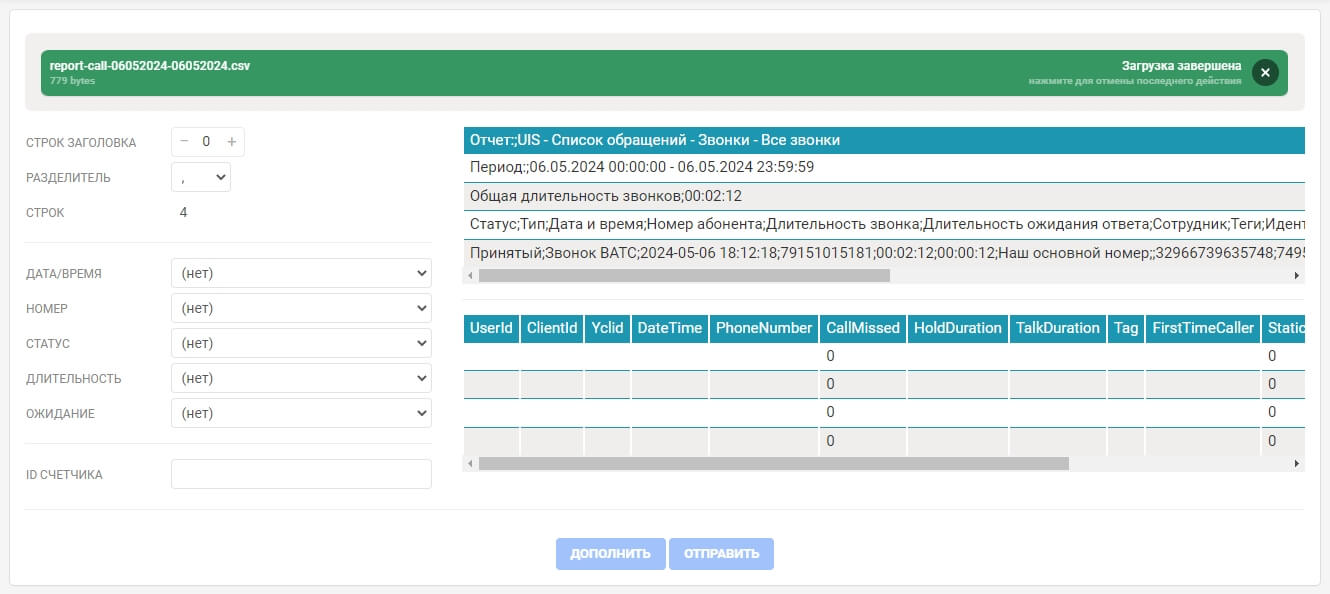 Кликаем в области загрузки файла и выбираем наш файл report-call-06052024-06052024.csv или просто