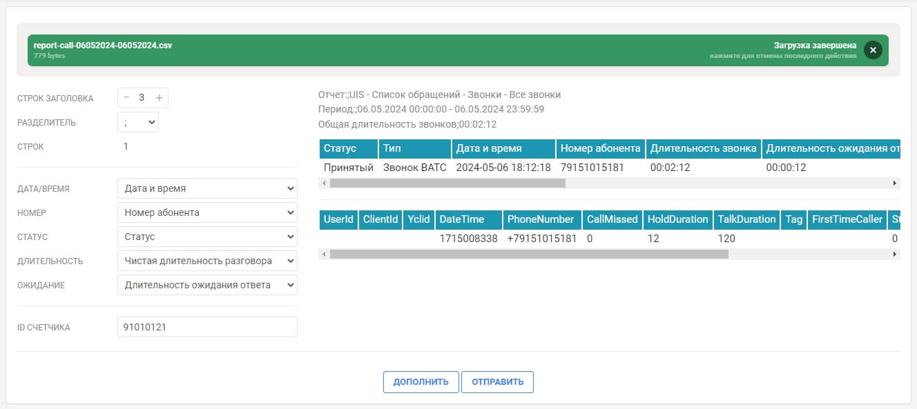И для каждого типа данных выбираем в выпадающем списке соотвествующую ему колонку CSV-файла. А так же указываем номер счётчика для которого мы будем загружать данные по звонкам. Вот теперь таблицы приобретают законченный вид.