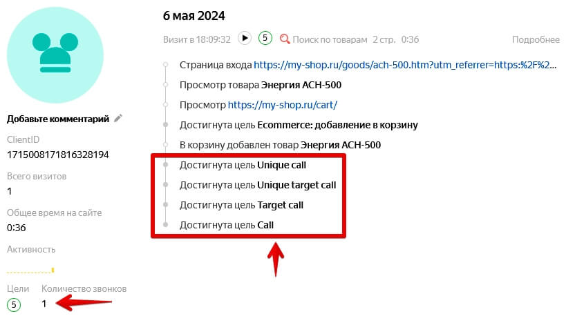 обработки данных все строки будут "привязаны" - каждому звонку будет сопоставлен посетитель, зарегистрированный метрикой.